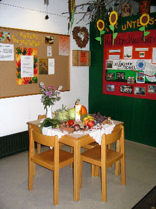 Im Eingangsbereich befindet sich die Informationstafel des Kindergartens. Hier werden wichtige Termine, Veranstaltungen, Krankheit, Projektthemen und deren Ziele, der Essensplan und Sonstiges bekannt gegeben.